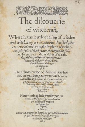 En 1584, Reginald Scot, caballero y miembro del parlamento de Kent, publicó este libro como un tratado escéptico que registra y desacredita las creencias populares y eruditas sobre la brujería, la magia y otras supersticiones.
