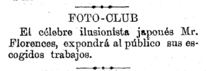 "El célebre ilusionista japonés Mr. Florences, expondrá al público sus escogidos trabajos."