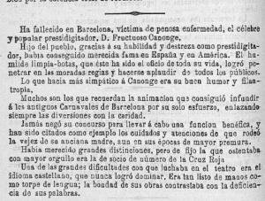 "Ha fallecido en Barcelona, víctima de penosa enfermedad, el celebre y popular prestidigitador D. Fructuoso Canonge.