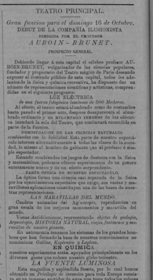 Debiendo llegara esta capital el célebre profesor AUBOIN-BRUNET, vulgarizador delas ciencias populares, fundador y propietario del Teatro mágico de París deseando exponer al ilustrado público de esta capital, todos los adelantos de esta capital, todos los adelantos de la física y química recreativa, ha dispuesto dar un número de representaciones científicas y artísticas, comprendidas en el siguiente programa: