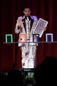 En sus actos realiza una mezcla de magia, ventriloquía y humor.