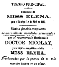 >"Ante un público más numeroso de lo que era de esperar, se presentaron ayer en el teatro Alhambra el doctor ilusionista Nicolay y su hija miss Elena.