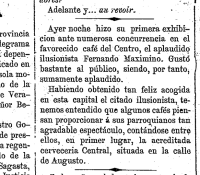 "Ayer noche hizo su primer exhibición ante numerosa concurrencia en el favorecido café del Centro, el aplaudido ilusionista Fernando Maximino. Gustó bastante al público, (...)