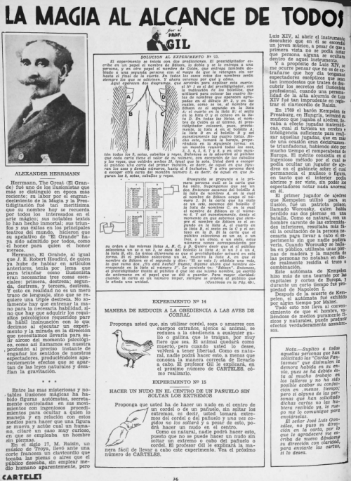 "La magia al alcance de todos" es una sección de la revista cubana "Carteles" en su número del 19 de junio de 1932, escrita por el Profesor Gil, ilusionista cubano.